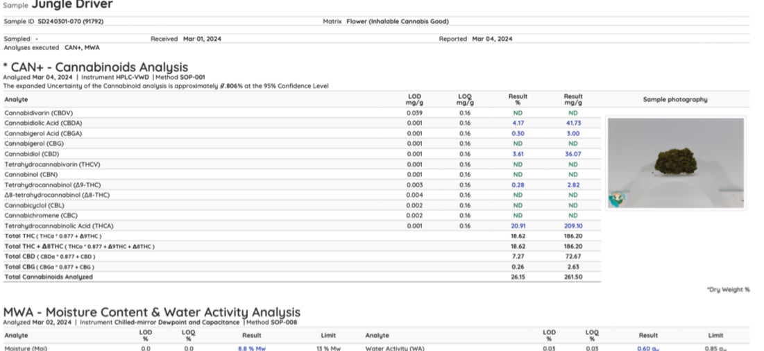 - Potency: Averaging 20.91% THCA per batch